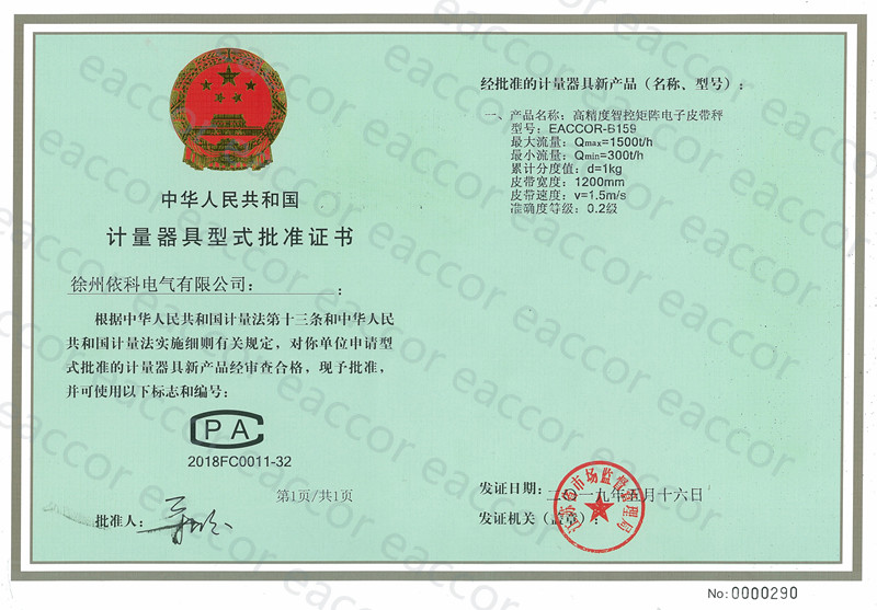 熱烈祝賀徐州依科電氣有限公司專利技術高精度智控矩陣電子皮帶秤EACCOR-B159獲得0.2級計量器具型式批準證書?。?!