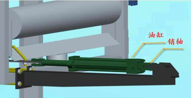 ?、?把液壓缸的兩個(gè)耳環(huán)孔分別按照如圖所示的位置用銷(xiāo)軸裝在活塞桿卡子和油缸座上。